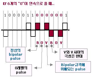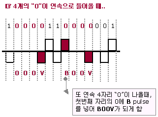에 또 4개의 0 연속 부호가 나오면 000V가 되는데 이때 첫번째 자리의 0에 B pulse를 넣어 B00V가 되게 함