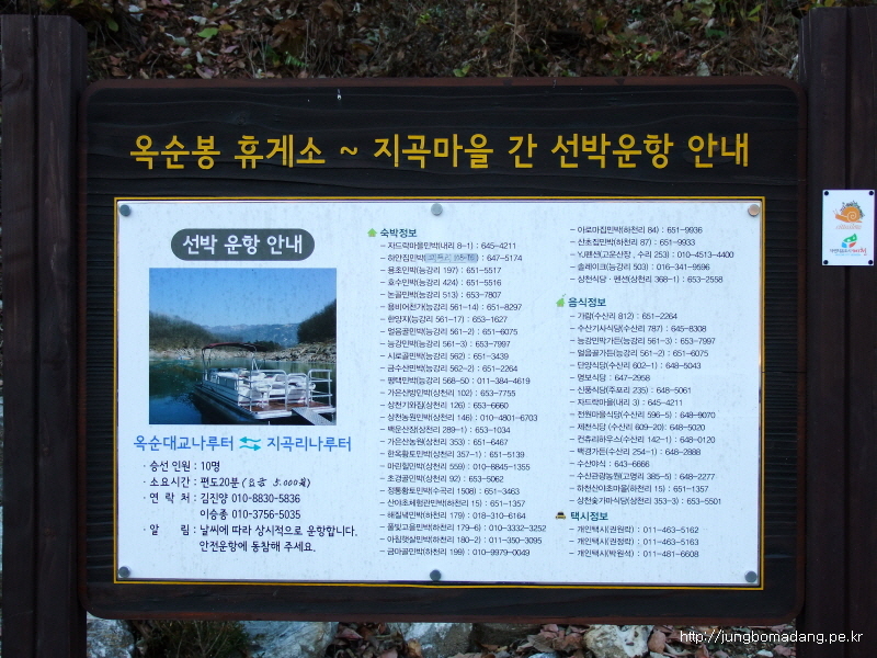 옥순봉휴게소에서 지곡마을까지 배로 20분이라고 합니다. 요금은 5000원