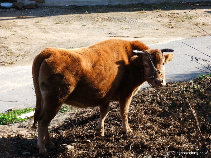 쉼터옆에 얌전하게 묶여있는 소가 풍경이네요~