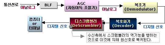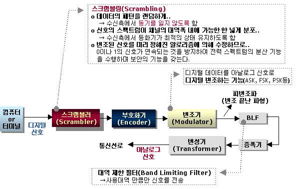 송신부에서는 컴퓨터 혹은 터미널로부터의 디지털 데이터를 스크램블러를 통해