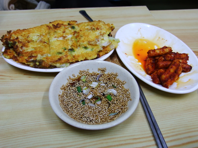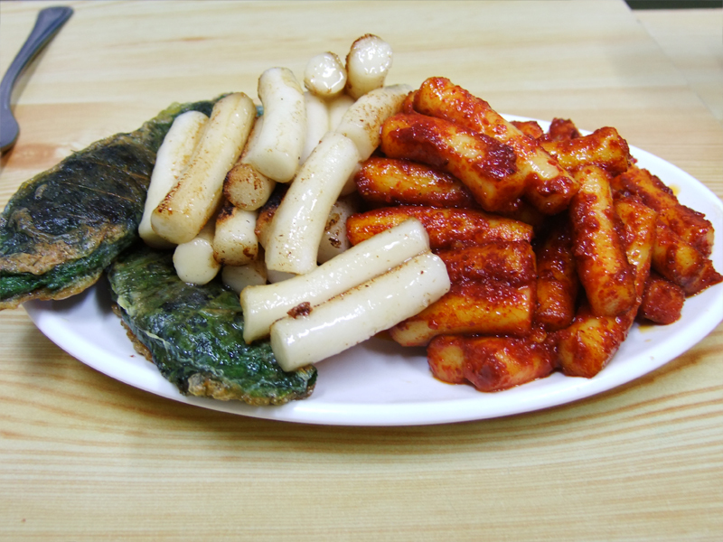 고추장떡볶이 1인분, 간장떡볶이 1인분, 깻잎전은 싸비스...