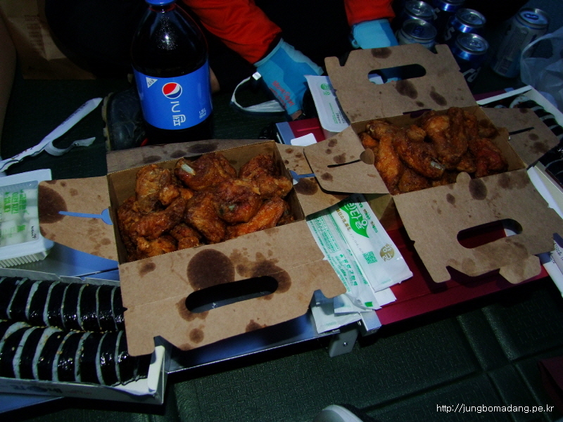 제가 야무지게 챙겨간 3단 발포매트를 깔고, 테이블 2개 펼치고 삼각대도 무려 2개(카메라용,자작랜턴용), 자작랜턴의 켜는 순간 함께하신 분들 깜놀! 하지만, 주변의 벌레들을 소환하는 기능이 있어 그건 좀 아쉽! 추운분들은 제가 챙긴 담요도 덮고, 어쨌든 교춘간장치킨과 긴가?네! 김밥과 근처 편의점에서 사온 맥주캔으로 즐거운 식사를 하게 되구요. 바람이 찰지게 부는 데 다행히 벽이 있는 곳에서 다소 편안하게 식사를 합니다.