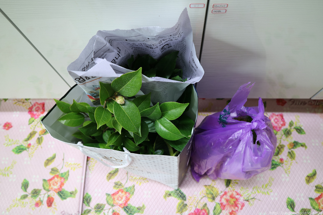 두둥~ 동백나무가 빼꼼 고개를 내밀고 있네요. 신문지에 쌓여있는 것은 황금죽