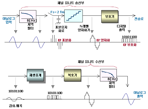 (Sampling)하고, 표본값의 진폭을 양자화 과정을 거쳐 이산적인 양자화 레벨에 가장 가까운 레벨