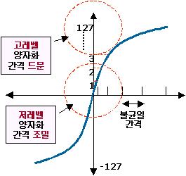 이용하여낮은 레벨에는 양자화 레벨을 조밀하게하고, 높은 레벨에서는 드물게함으로써