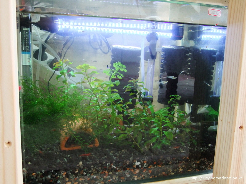 일하는 김에 수초도 정리합니다. 위쪽 수족관의 수초가 너무 잘자라서 수면위로 뚫고 나올거 같아서 중간에 적당히 잘라서 치어 수족관에 심었네요. 정리된 모습