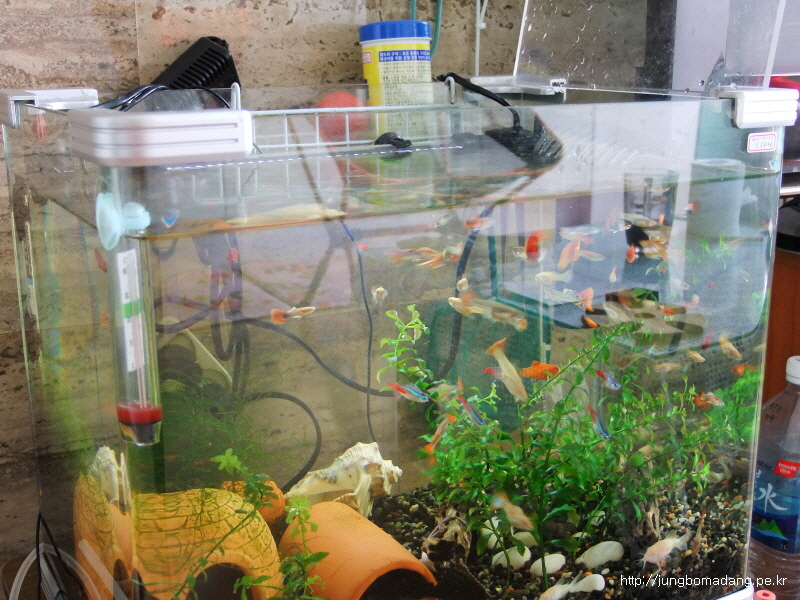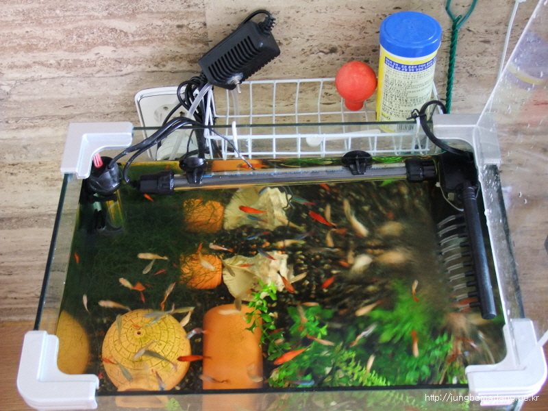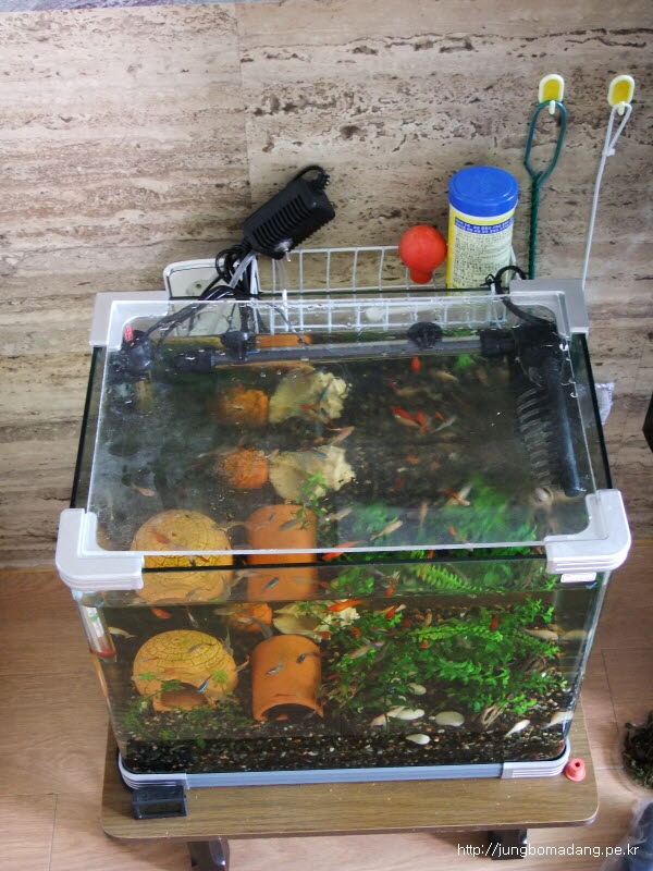 현재 수족관의 모습입니다. 좌측엔 여름 지났으니 수온 조절을 위해 히터 하나 달려있고, 온도계도 있구요. 우측 뒷편에는 측면여과기, 뒷편에는 LED수중등, 수족관 뒤로는 다이소에서 산 수납매쉬망에 사료와 스포이드, 핀셋이 있고, 우측 벽면에는 뜰채망이 있네요.