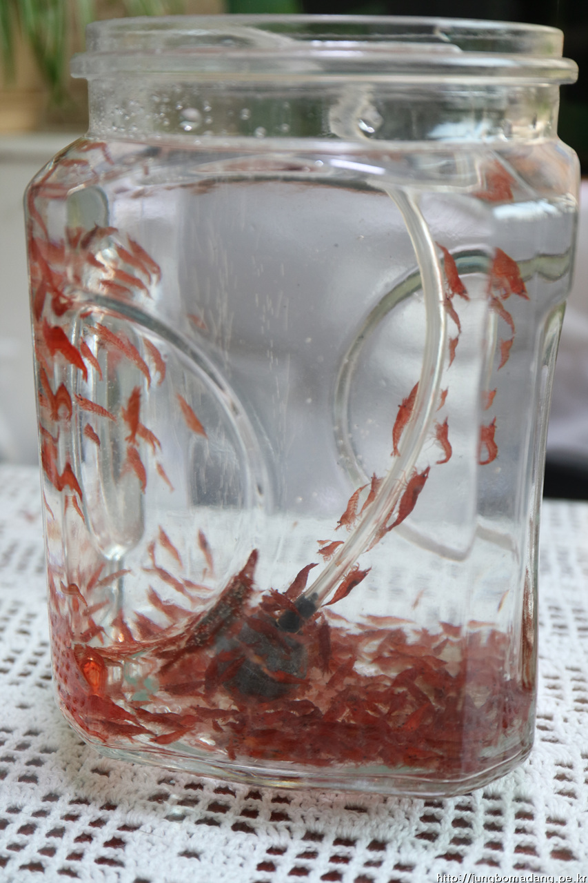 엎친데 덮친격으로 녹조가 엄청 끼어서 수족관을 바꿔주려고 요래 임시로 체리새우만 모두 건져줍니다.