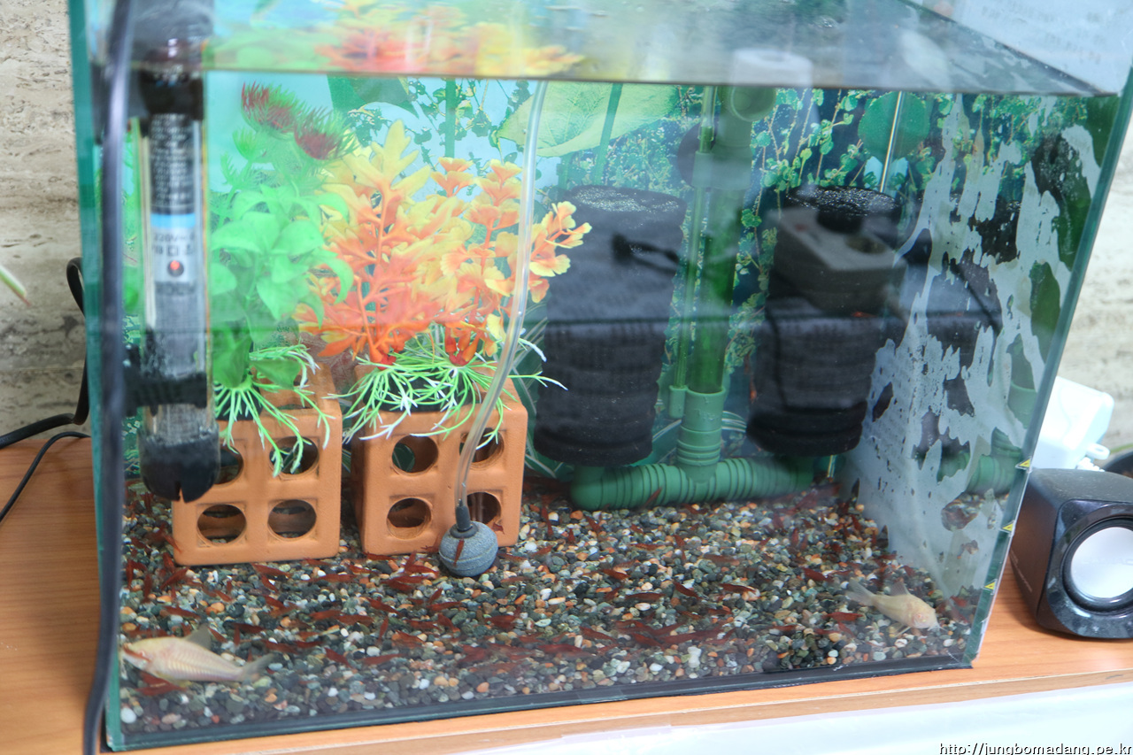 수족관에 살던 나비비파 1마리, 닥터피쉬 2마리 모두 죽고, 구피와 네온테트라와 플래티도 살지 못하는 죽음의 수족관... 하지만, 체리새우는 계속 번식해서 이만큼! 코리도라스 2마리 건재.