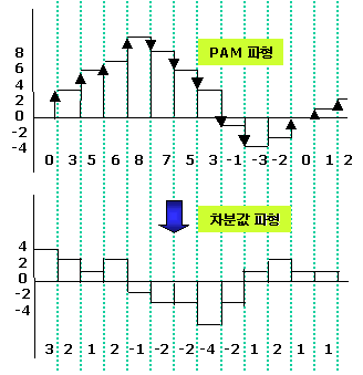 그림에서위쪽그림은PAM 신호이고, 아래쪽그림은예측PAM 신호에서PAM신호값을