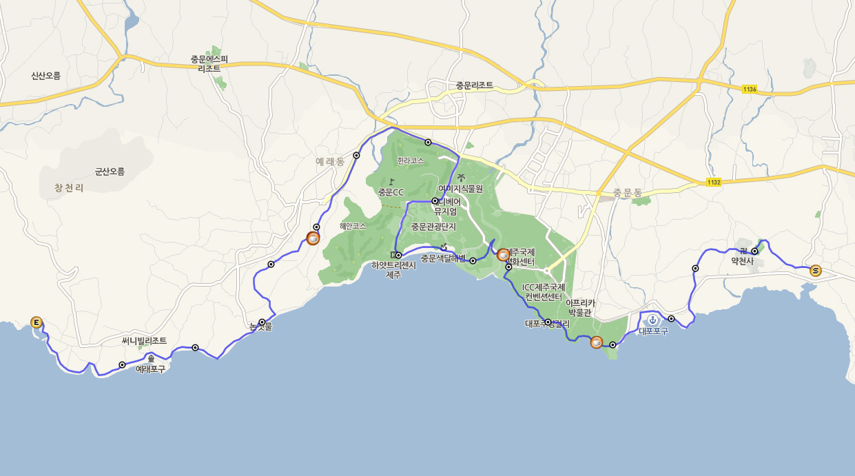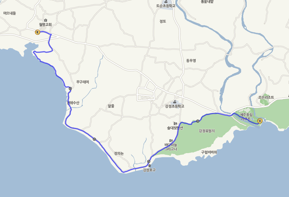 강정으로 향하네요. 7코스 종점은 월평입니다. 7코스를 어제와 함께 두번에 걸쳐서 걷고 있네요.