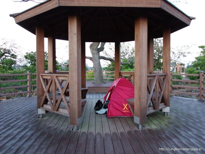 18:30 바닷가 정자에서는 텐트 쳤다가는 모세의 기적 일어날 것 같아서 이렇게 무대로 되돌아와서 벽에 붙여서 텐트 세팅 완료! 오늘의 공연은 없습니다. 걍 저혼자 텐트 치고 자빠져 자기? ㅋㅋㅋ