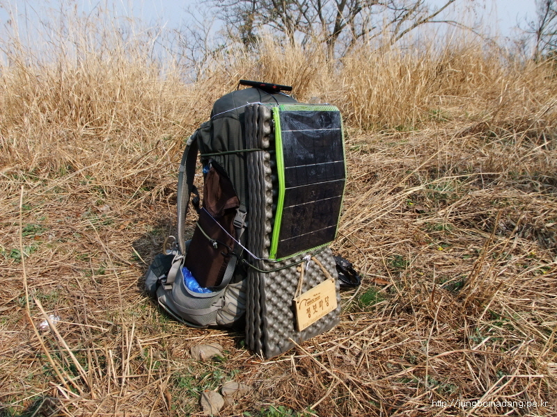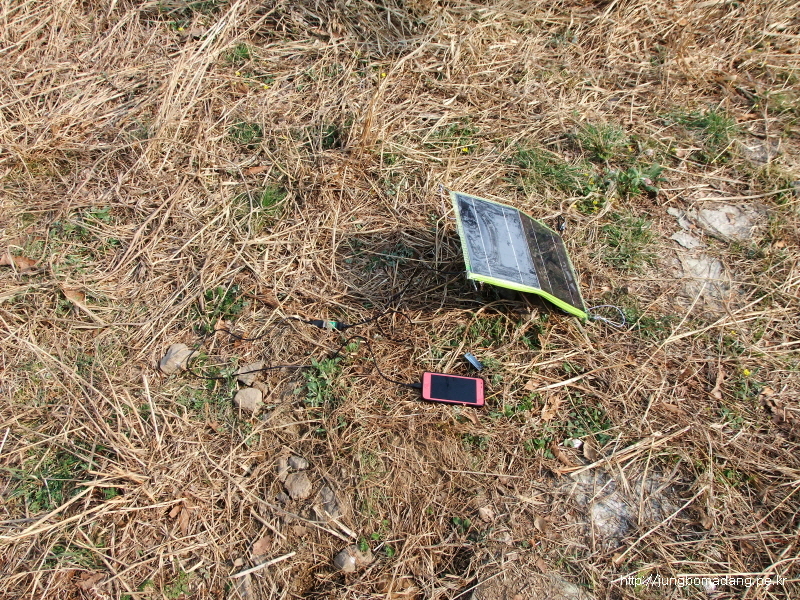 누군가 실수로(?) 두고간 정이 넘치는 과자 껍데기... 배낭에 찔러 넣구요... 첨 만난 등산객 부부중에 남편분이 제 등뒤에 붙여 있는 솔라패널에 급 관심을 보이시네요. ^^