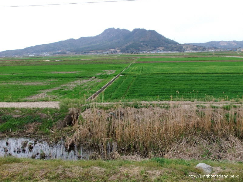 보리밭 뒤로 청자 모양으로 산을 깎은 모습이 이채롭네요.