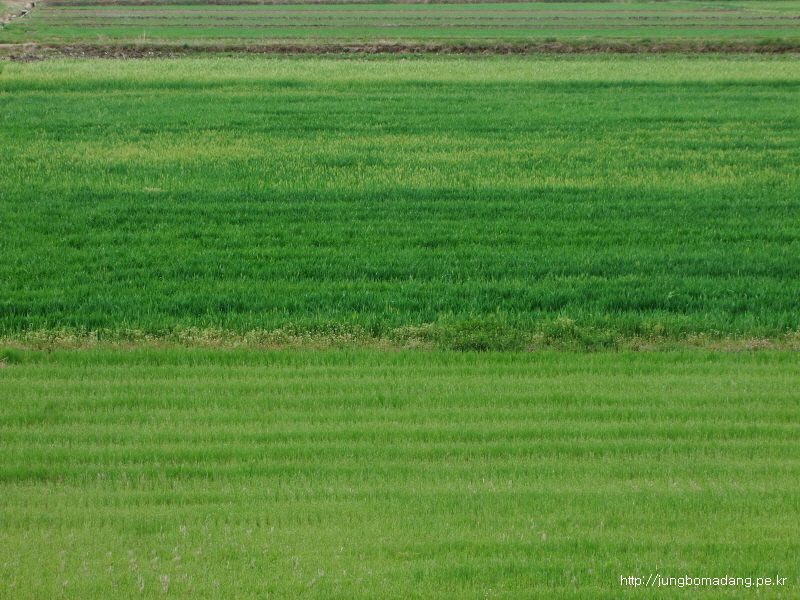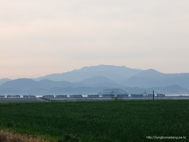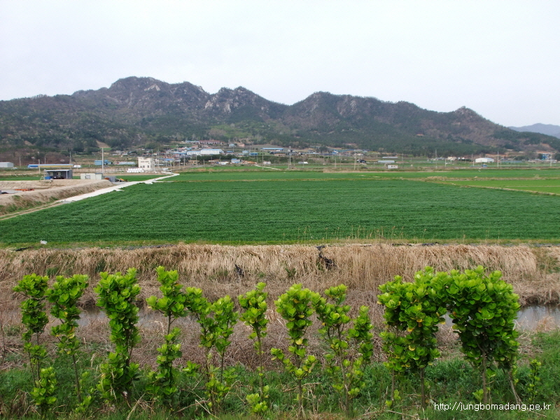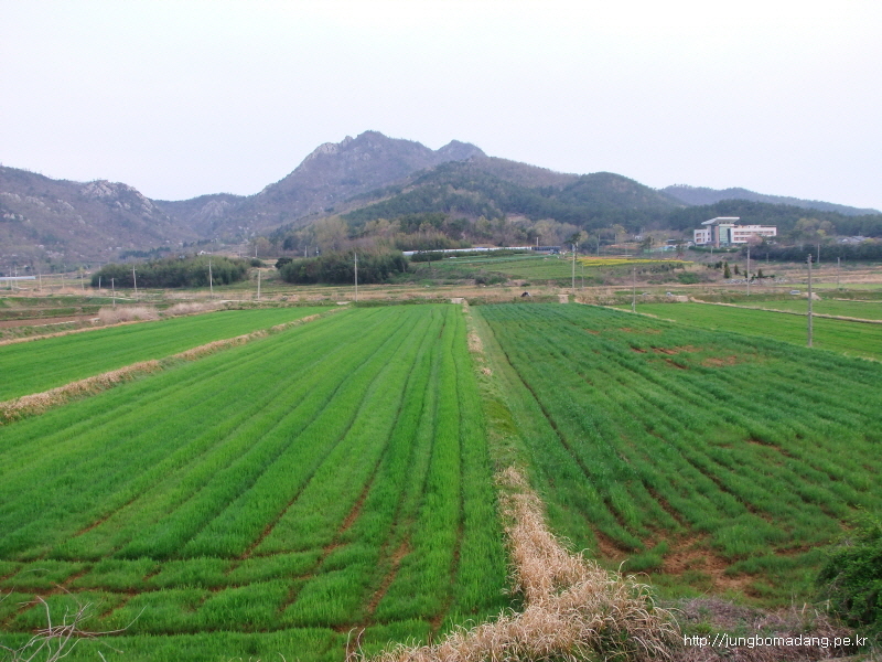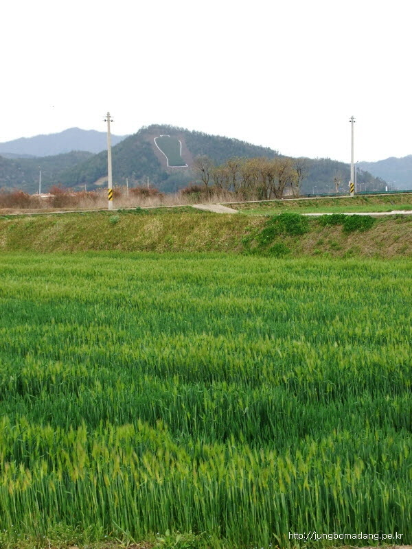 보리밭 뒤로 청자 모양으로 산을 깎은 모습이 이채롭네요.