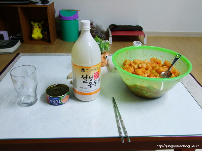 그렇게 기절하고... 담날은 이렇게 깍두기 담궈서 강진서 득템해온 설성동동주와 한잔... 우와 근데 이게 약간 시큼하니 꽤 맛나네요...