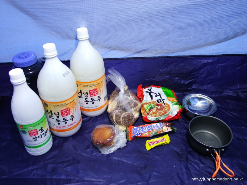 막걸리 2, 약과 4개, 과자 약간, 라면 1