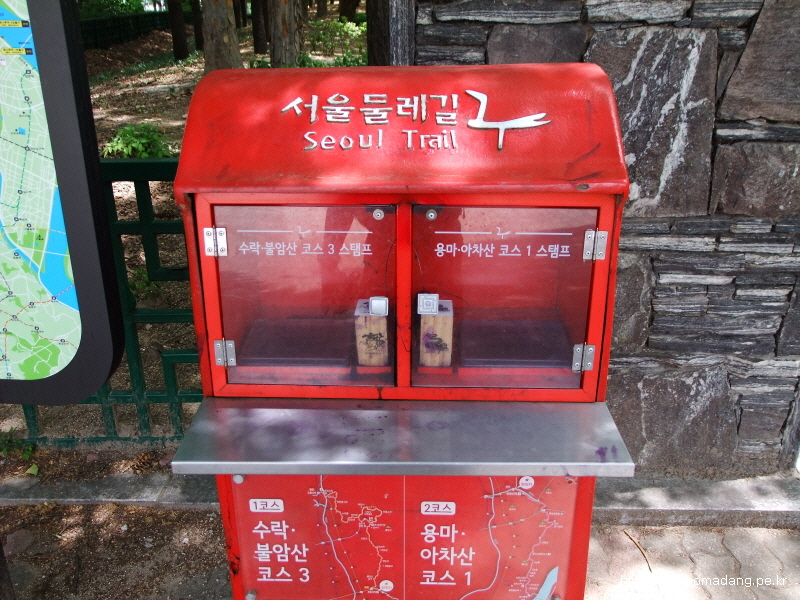 왜 스탬프가 하나 비지?? 알고보니 3코스는 길어서 스탬프가 4개였던 것입니다. ㅠㅠ 방이동생태경관구역쪽에 우체통이 있는 데 걍 지나쳤네 ㅠㅠ 어쩔수 없죠 오늘이나 내일 저녁에 한번 찍으로 와야지요... 참고로 인증서 받으려면 도장 하나도 누락하면 안된다고 합니다.