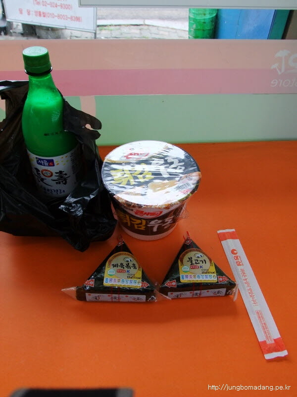오늘은 36키로 걸었구요. 먹은건 과자 몇개, 막걸리 1병, 삼각김밥 2개, 컵라면 1개