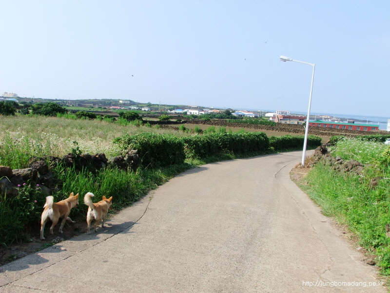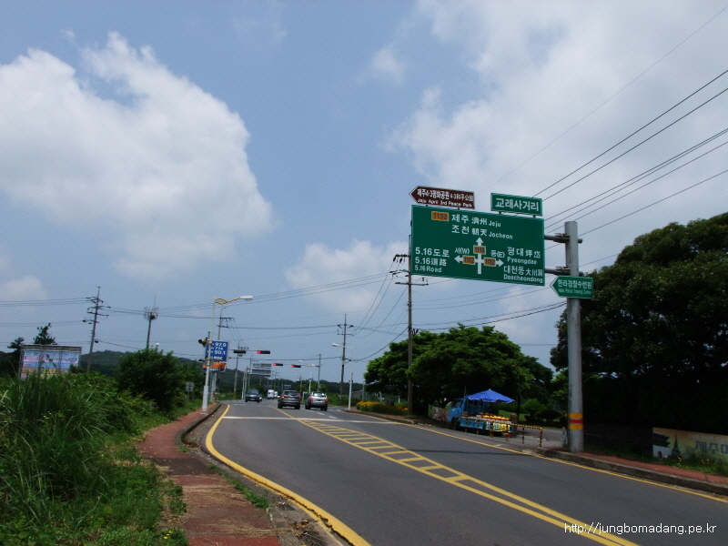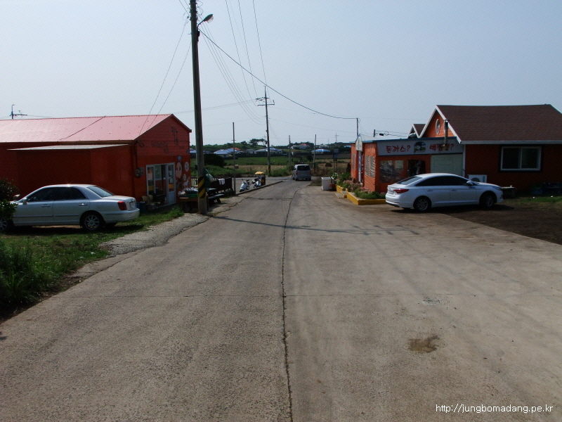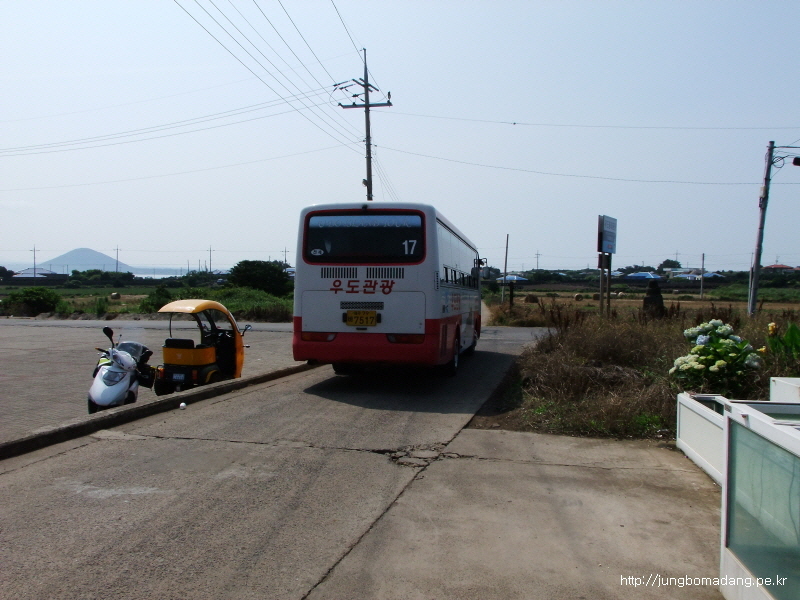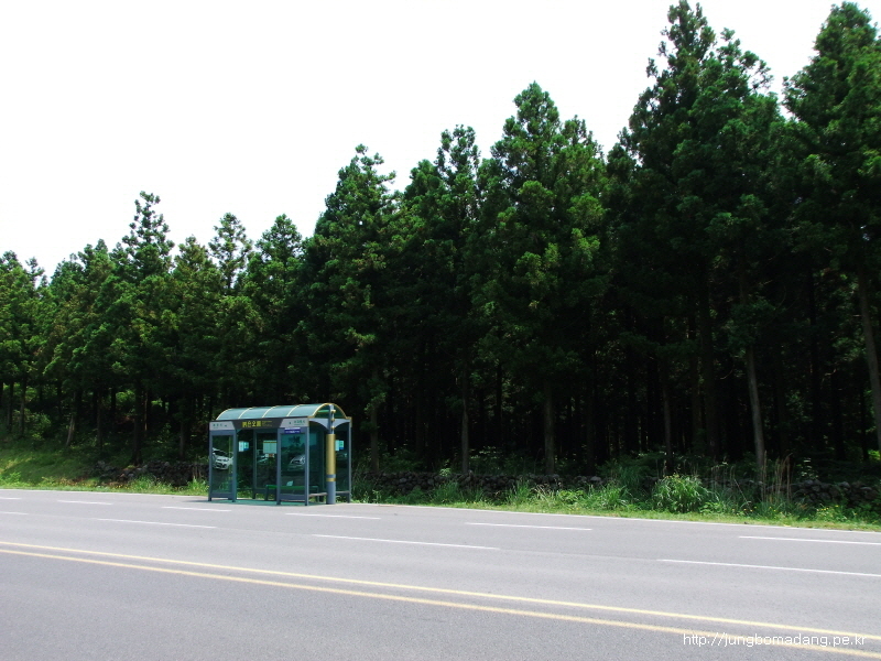 건너편에 버스정류장이 보이네요. 버스도 뜸하게 오고... 우도로 가기위해 교래사거리까지 걸어 이동하고, 거기서 버스로 성산까지 이동할껍니다.