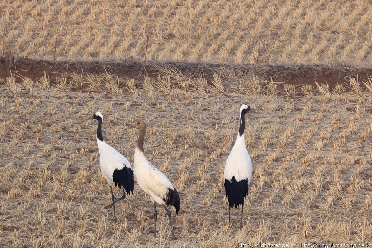 가만히 보면 머리 부분이 황색인 녀석이 있는 데 이 녀석은 어린새(새끼) 그 양옆에는 부부(암,수)로 생각됩니다. 두루미 가족은 보통 3-4마리(암수 어미 2, 새끼1-2)로 이뤄진다고 하네요.  암수 구별은 육안으로 쉽지 않고 울음 소리로 구별되는 데 예민한 녀석이라 멀리서 소리로 구별하기 쉽지 않습니다.