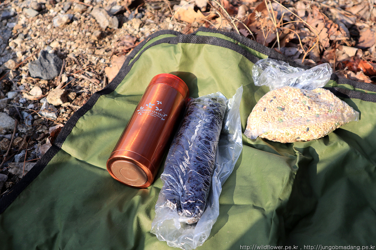 점심시간이 되어 집에서 간단히 말아온 김밥 두줄로 허기를 면합니다. 오른쪽 잡곡 봉지는 새들에게 바치는 먹이로 끝날 무렵 뿌려 두었습니다.