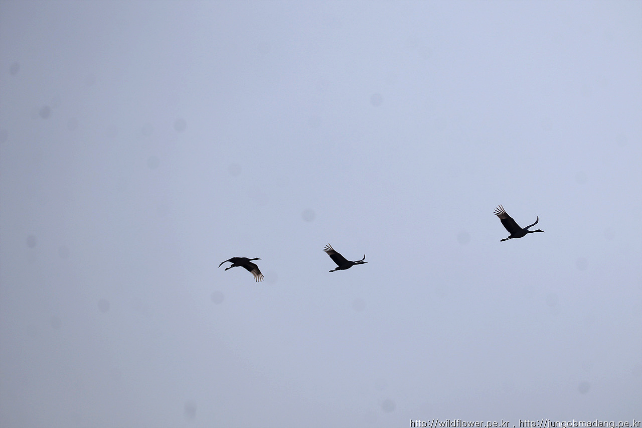 하늘 위로 멀리 흑두루미 세마리도 보입니다.
