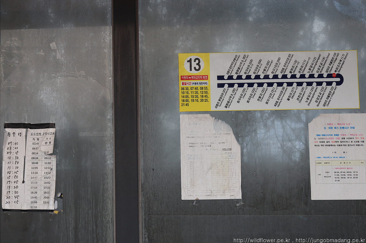 버스 정류장의 시간표를 찍어봅니다. 13번 버스는 참고로 (구)철원인 동송(이평리)까지 오고가는 버스 입니다.