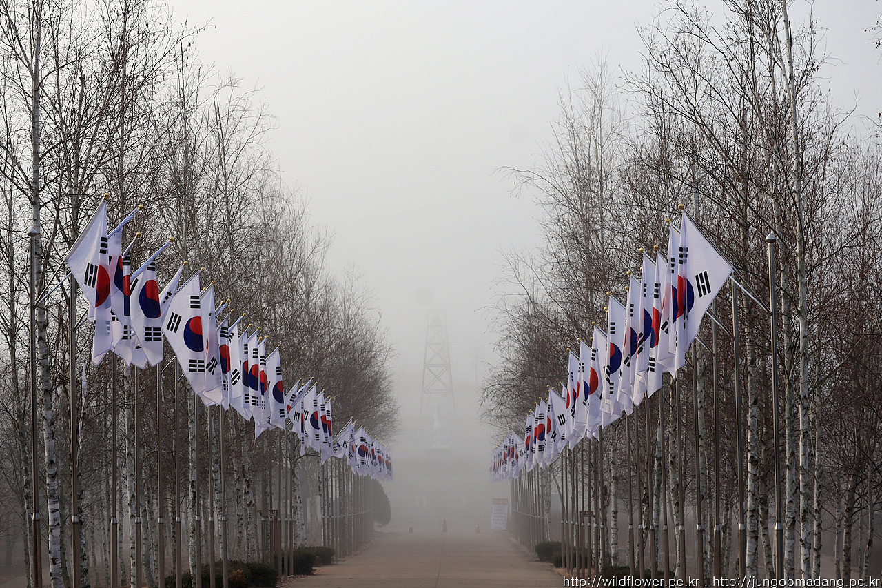 태극기와 자작나무의 숲 - 두루미와 재두루미와의 만남을 뒤로 하고 철수 합니다. 태극기와 자작나무로 이루어진 길을 지납니다. 정면에는 안개 때문에 잘 보이지 않는 백마 조형이 보입니다.