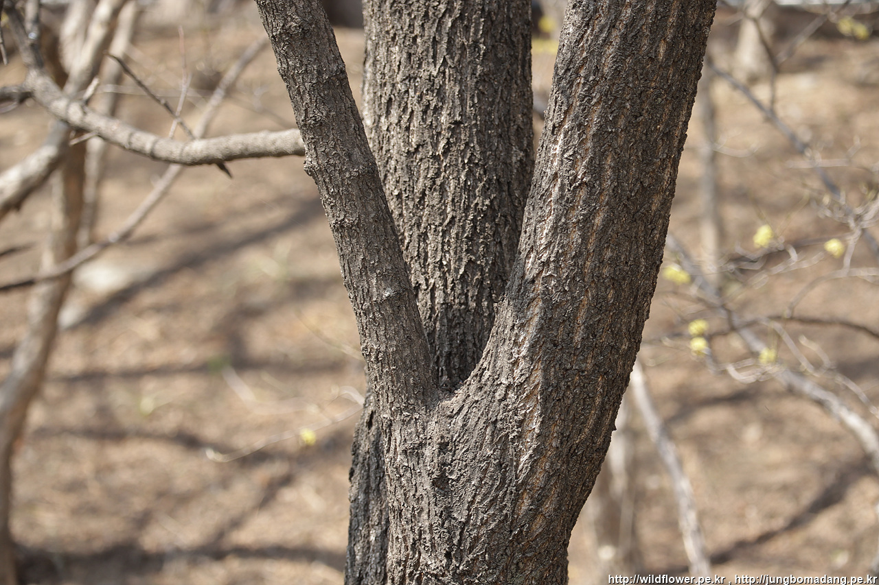 벚나무의 수피(나무껍질)은 보다 시피 수평 방면으로 흡집이 불규칙하게 나 있습니다. 수피로 살구나무와 구분하는 또 다른 방법입니다.