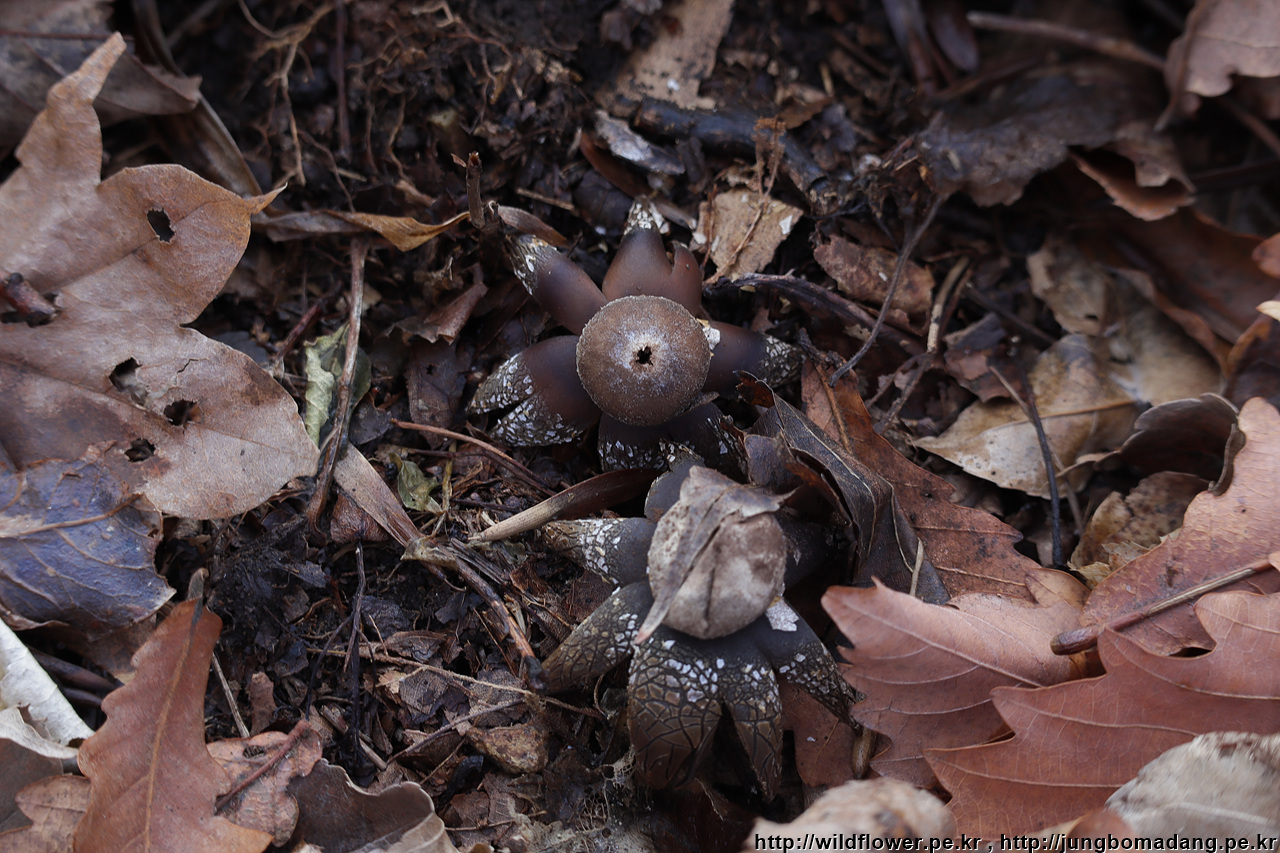 손으로 톡톡 건들면 가운데 구멍 밖으로 홀씨를 내뱉는 먼지버섯은 낙옆 이불을 덮고 있습니다.