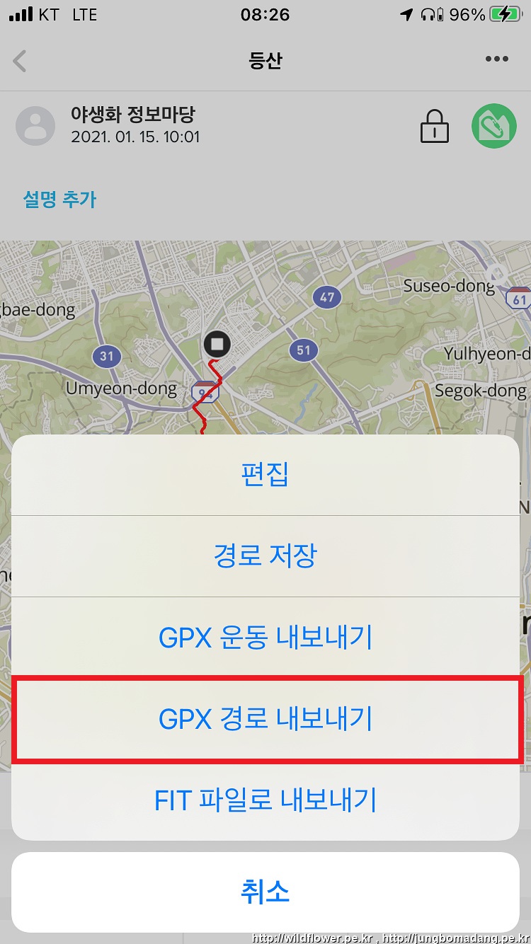 3. 메뉴가 하단에 나오는 데, GPX 경로 내보내기를 선택합니다.