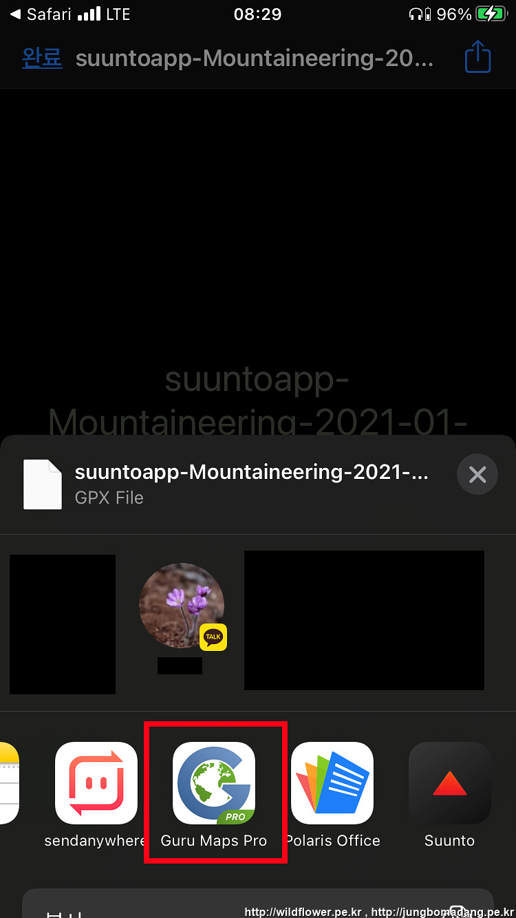 13. gpx 파일을 읽을 앱을 선택하게끔 나오는 데, GPX 앱(제 경우 Guru Maps Pro,유료)을 선택합니다.