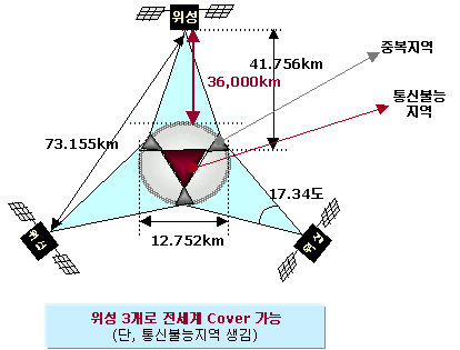 정지궤도 위성의 경우 3개의 위성만으로 극지방을 제외한 전세계 통신망을 커버할 수 있어 넓