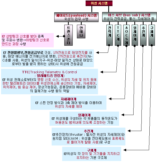 위성 시스템은 크게 위성의 임무를 수행하는 페이로드 시스템(payload system)과 위성의 전력