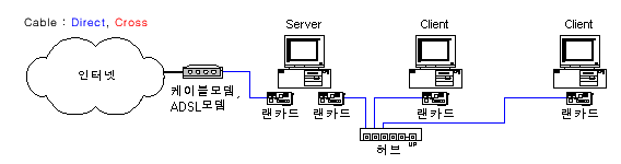 - ADSL모뎀 - 허브 : 다이렉트 케이블(허브쪽은 Uplink) or 크로스 케이블(양쪽 모두 Normal Port)