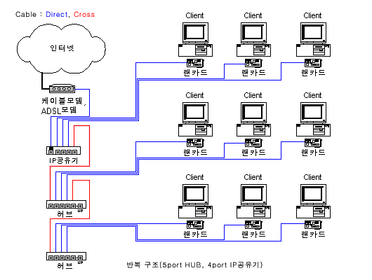 -준비물 : IP 공유 프로그램(SYGATE) 1개, 허브 1개, 크로스 케이블 1개, 다이렉트 케이블 여러개(연결할 컴퓨터 대수).