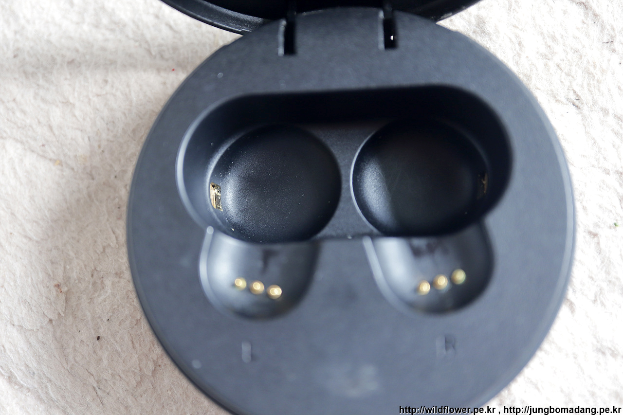두둥. 여기서 중요 포인트는 이어폰 충전 부분과 연결된 전원선이 가운데 금색으로 보이는 데, 나중에 이 부분을 다시 결합하기가 쉽지 않네요. 일단 배터리를 확인하려면 이 부분을 일단 분리합니다.