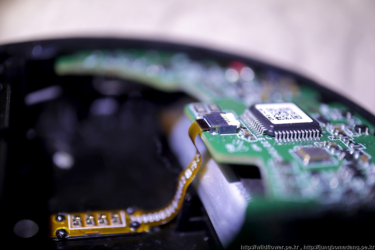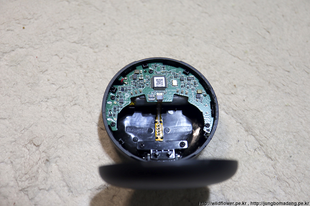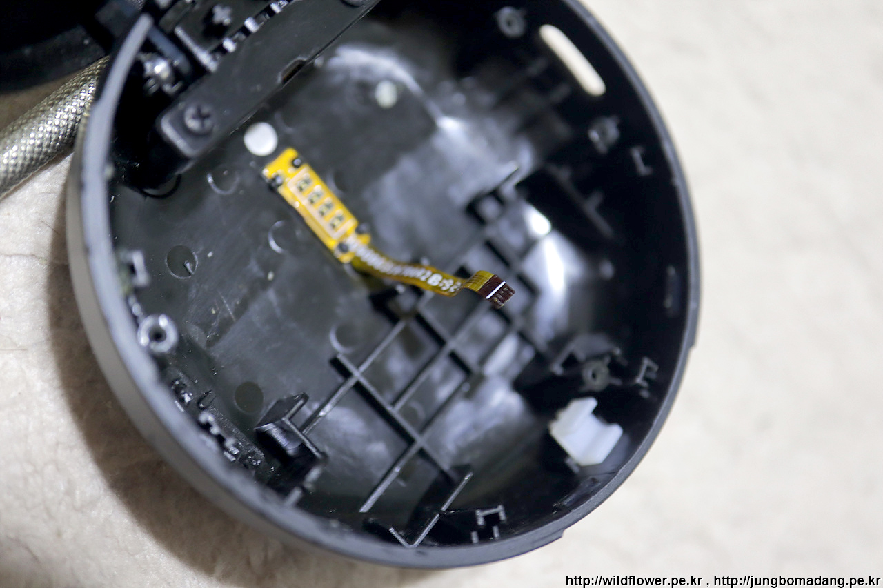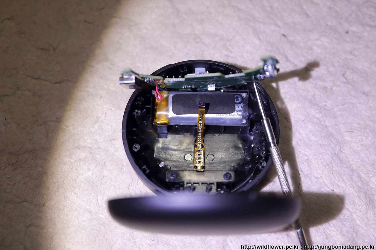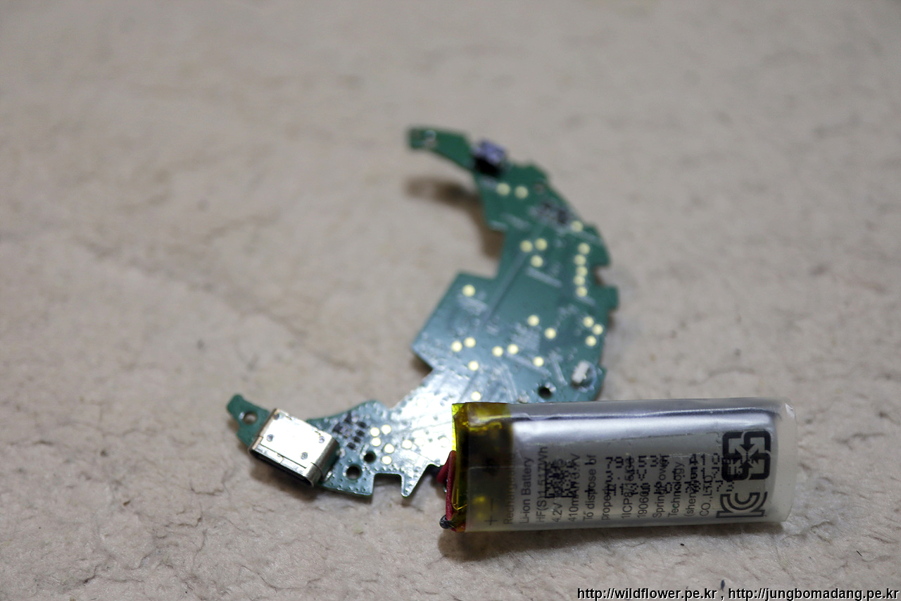 두둥. 여기서 중요 포인트는 이어폰 충전 부분과 연결된 전원선이 가운데 금색으로 보이는 데, 나중에 이 부분을 다시 결합하기가 쉽지 않네요. 일단 배터리를 확인하려면 이 부분을 일단 분리합니다.