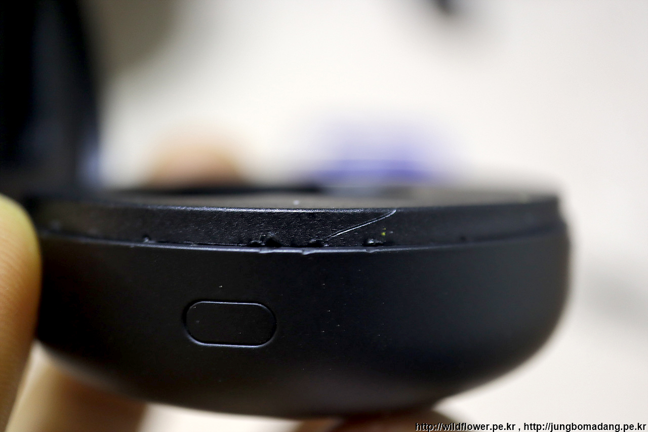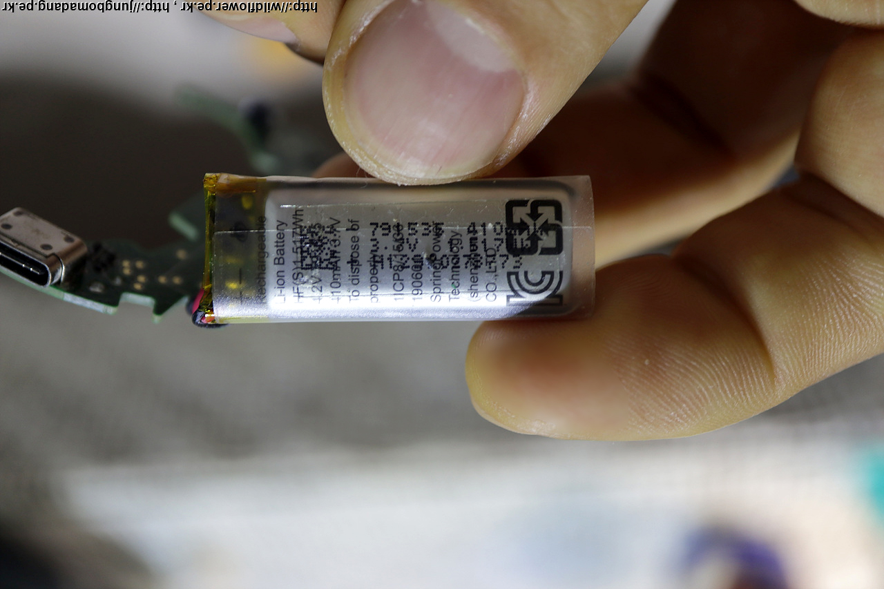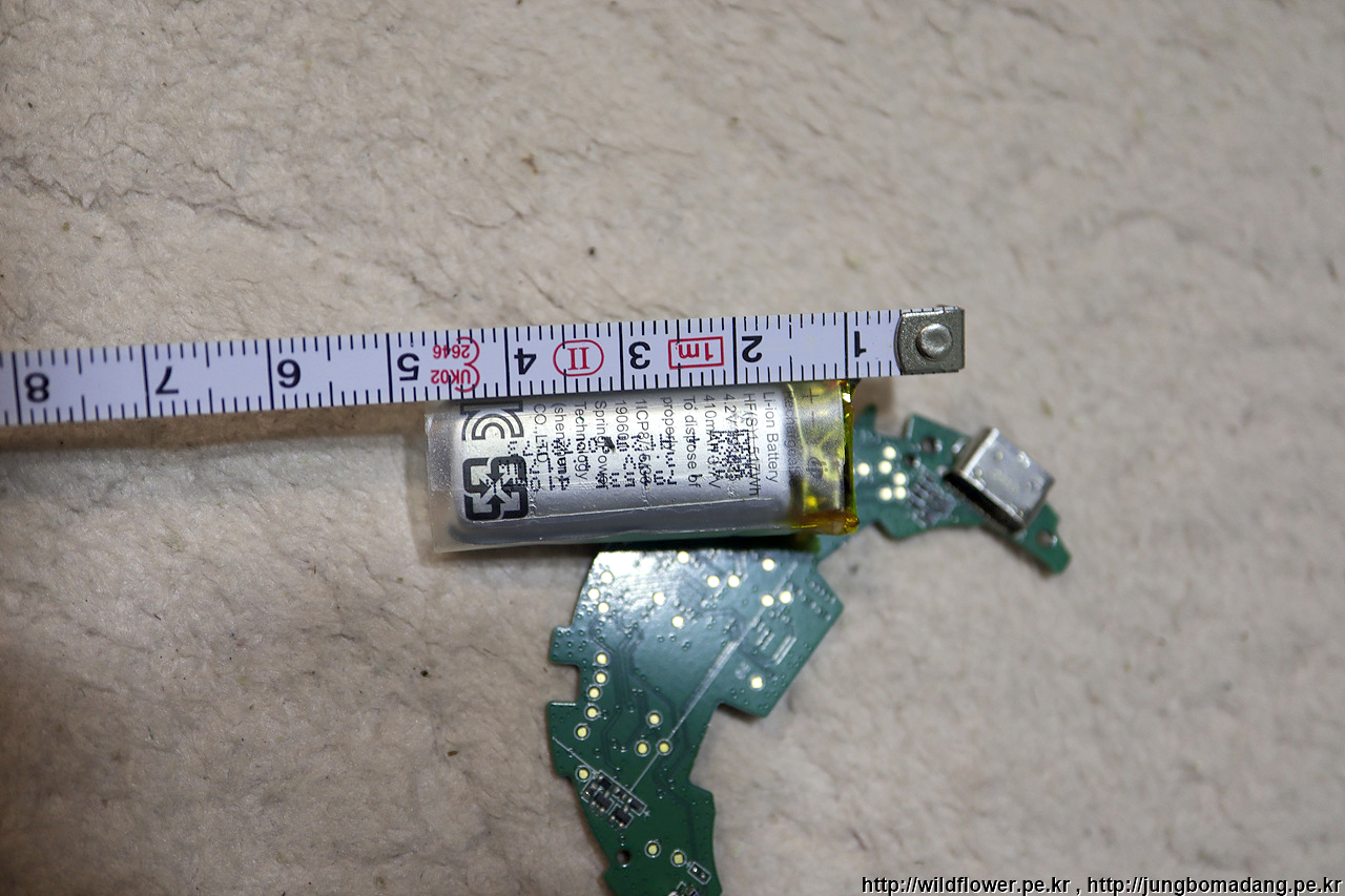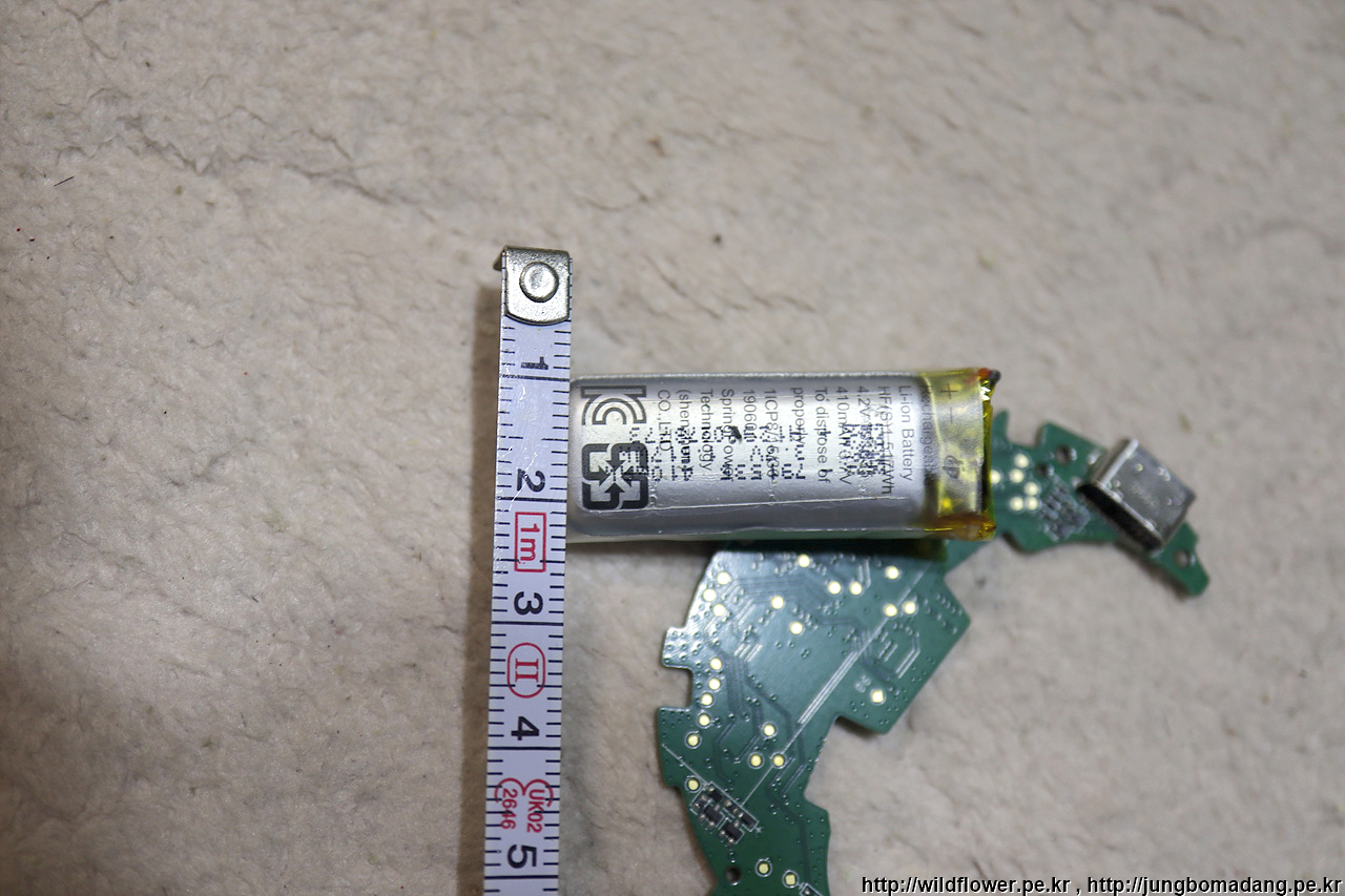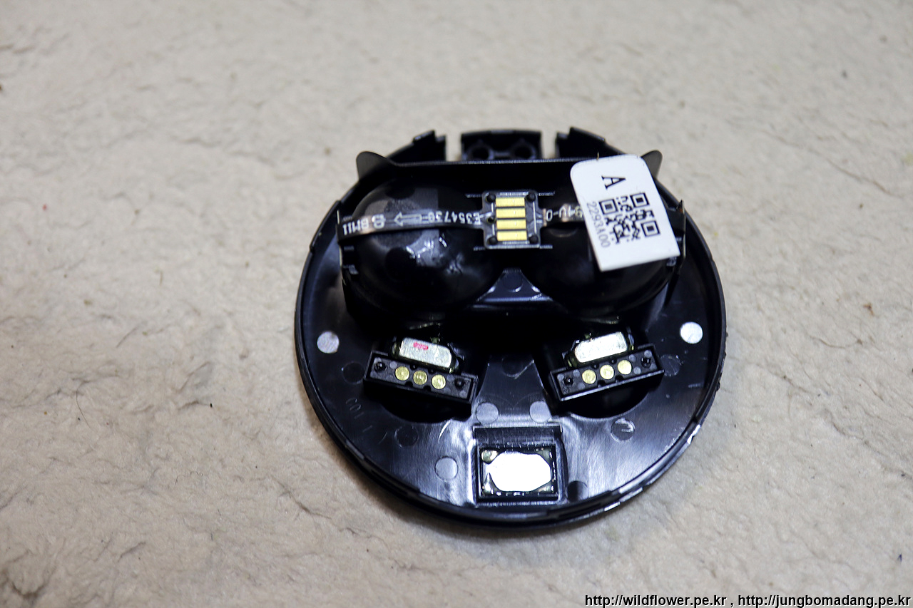 두둥. 여기서 중요 포인트는 이어폰 충전 부분과 연결된 전원선이 가운데 금색으로 보이는 데, 나중에 이 부분을 다시 결합하기가 쉽지 않네요. 일단 배터리를 확인하려면 이 부분을 일단 분리합니다.