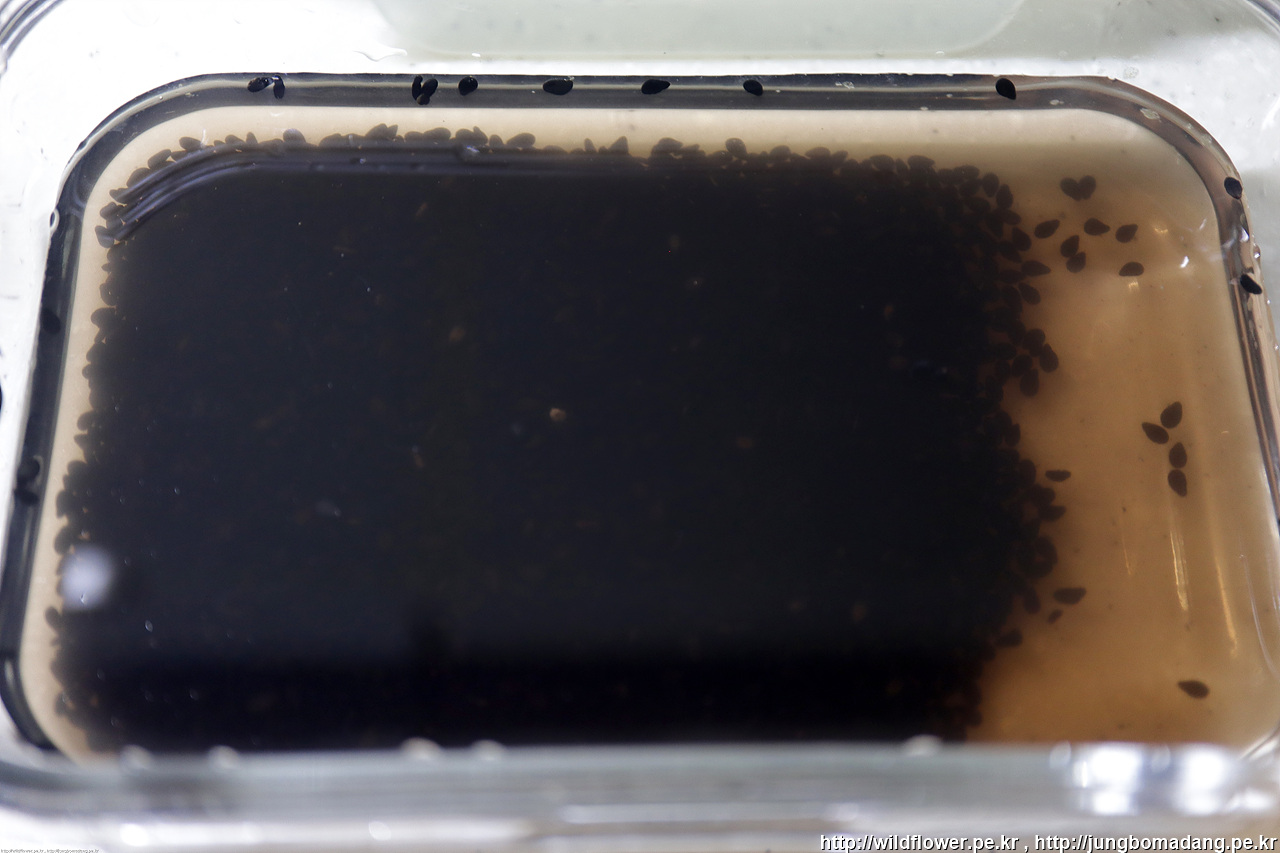 투명한 유리병(또는 밀폐용기)에 물을 적당히(제경우 검은깨 2 큰수푼에 종이컵 한컵의 물) 넣고 1분 정도 흔들어 줍니다.