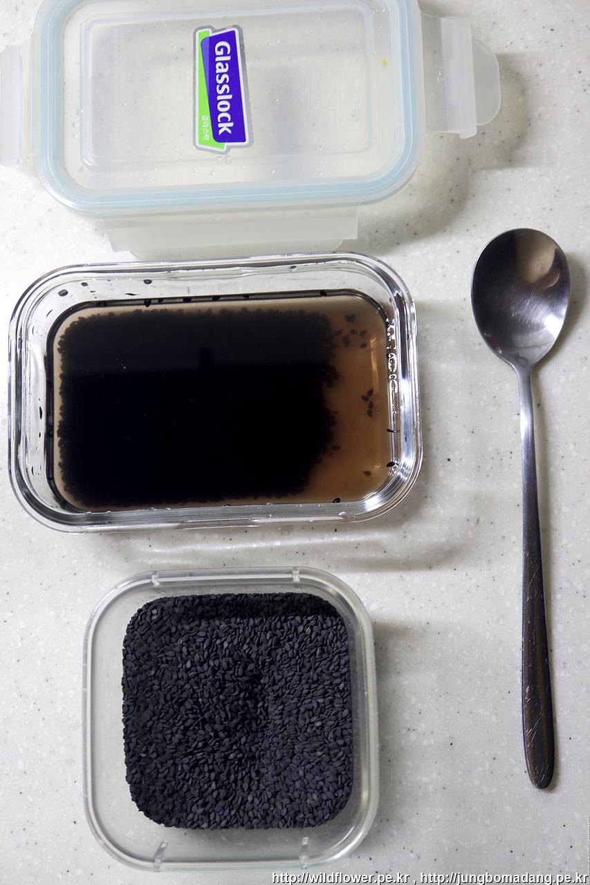 투명한 유리병(또는 밀폐용기)에 물을 적당히(제경우 검은깨 2 큰수푼에 종이컵 한컵의 물) 넣고 1분 정도 흔들어 줍니다.