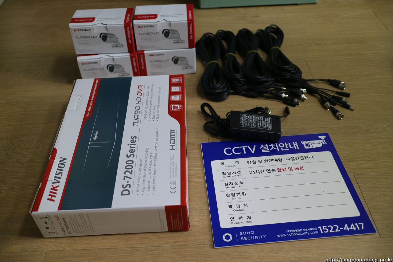 DVR(녹화기) 본체, 카메라 4대, 전원&데이터 케이블 4세트, 전원 어댑터(녹화기,카메라), CCTV설치안내판