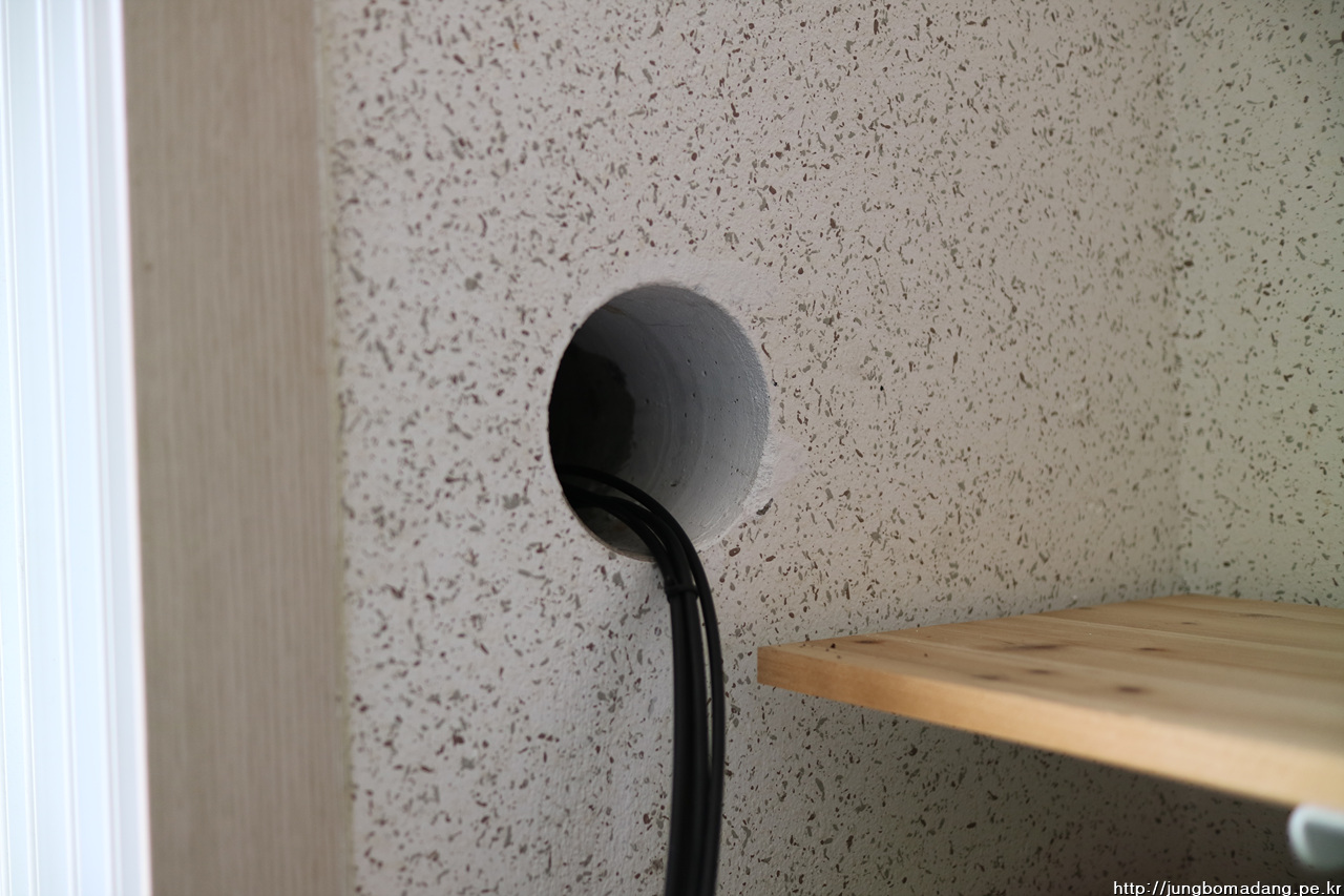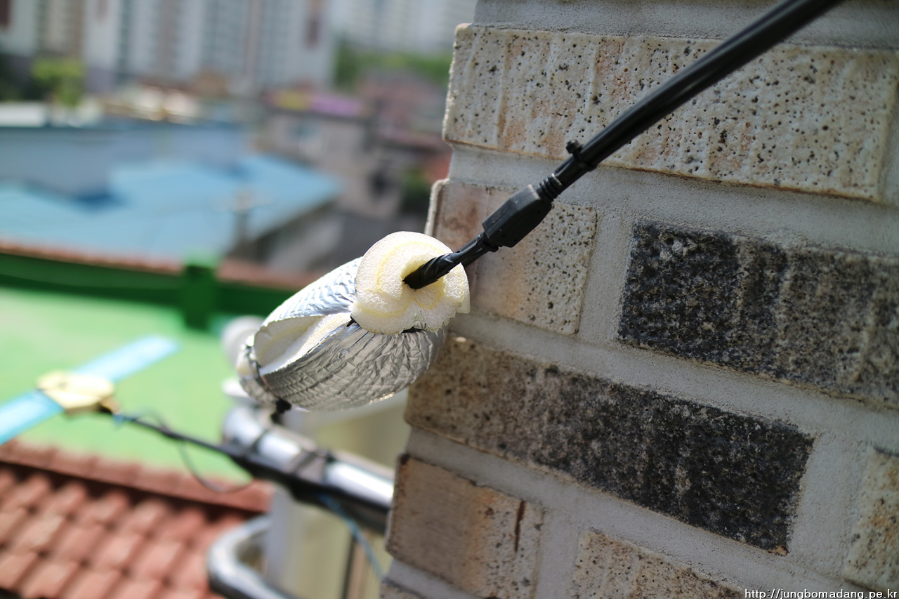 케이블을 어떻게 실내로 창문 뚫지 않고 들여올까 고민하다가 요래 보일러실에 미리 뚫려있는 환기창을 통해 들여옵니다. 안에 새등 들어오지 못게 철망 처리된 게 있는 데 어쩔수 없이 그거 빼고 남은 공간은 양파망으로 꽉꽉 채워 둡니다.