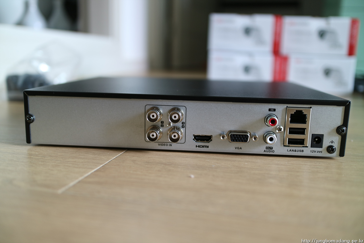 4채널짜리 입니다. 우측에 USB 포트로 녹화영상을 USB메모리로 빼내거나 USB 마우스 연결합니다. LAN포트도 있죠. 이걸 공유기에 연결하고 약간 설정을 하면 밖에서도 카메라로 찍히는 영상을 확인할 수 있습니다.