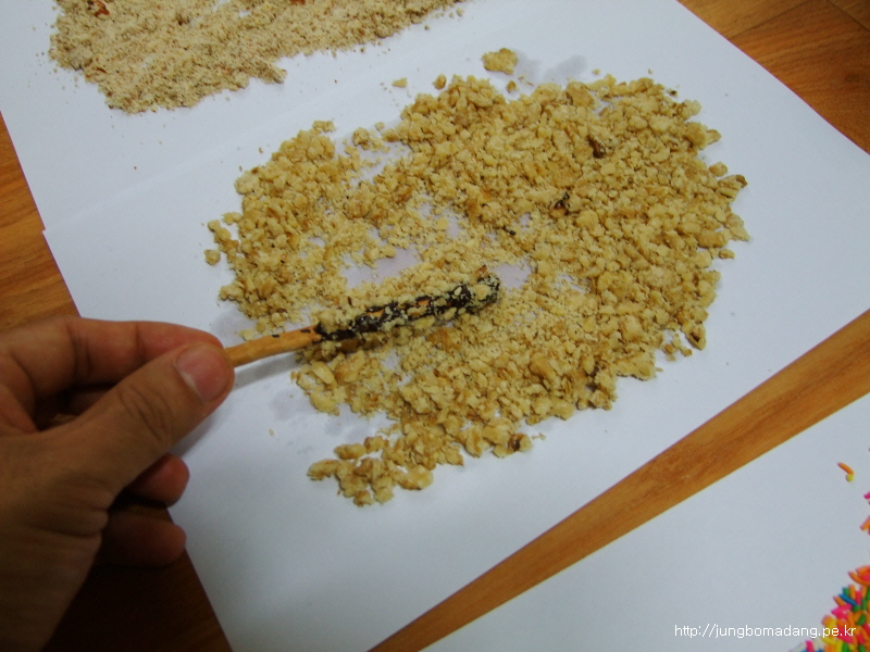 그렇게 중탕해서 녹으면 젓가락으로 적절히 건져서 참깨스틱에 묻히고