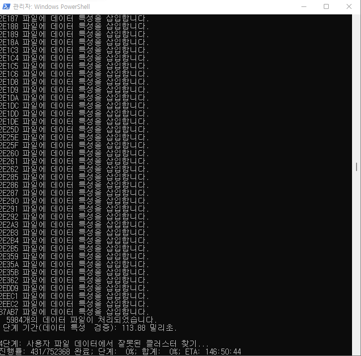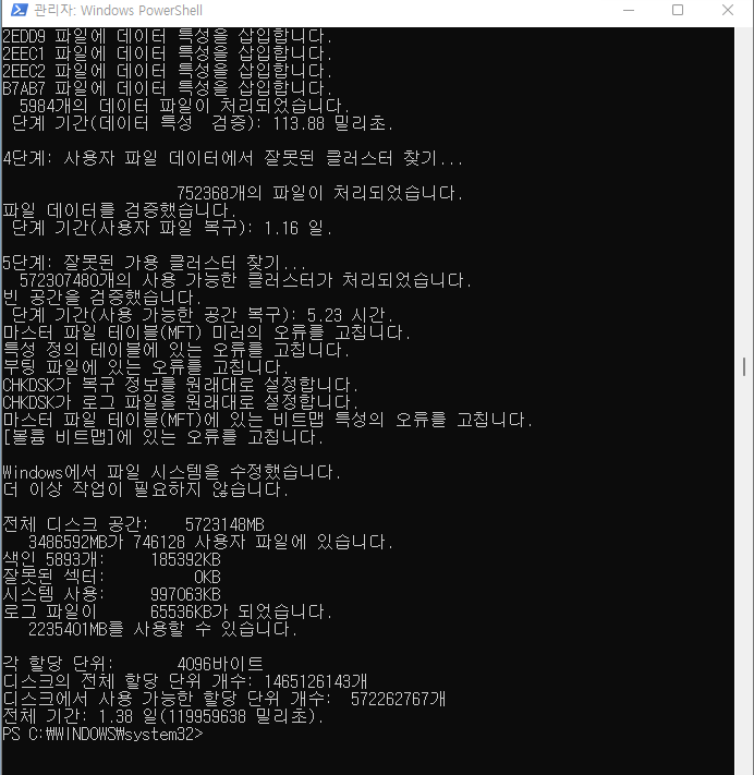 혹시나 해서 다시 한번 CHKDSK 명령을 수행합니다. 이번에는 /r 옵션이 아닌 /f 옵션으로 시도합니다.