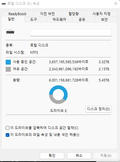 분명 데이터가 4TB 정도 들어 있는 데, 탐색기에서 E 드라이브의 속성을 들여다보니 0바이트로 나옵니다.
