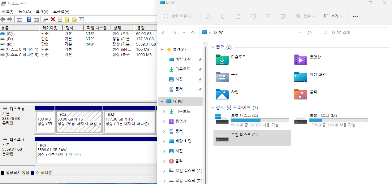 디스크 관리에서 확인하니 R 드라이브는 아직 RAW 파티션으로 확인됩니다.