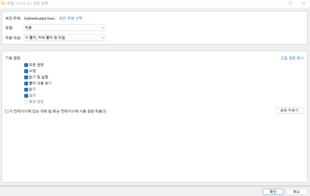 따라서 E 드라이브에 대해 Autheticated Users, Users 의 읽고/쓰기 권한이 부여해야될 것 같네요.